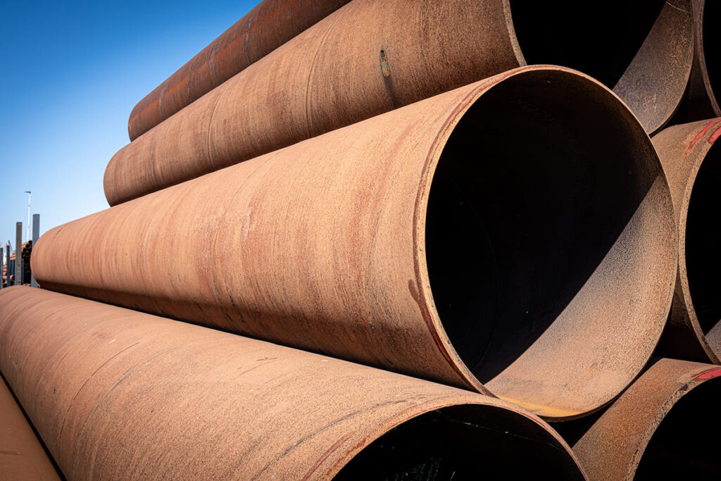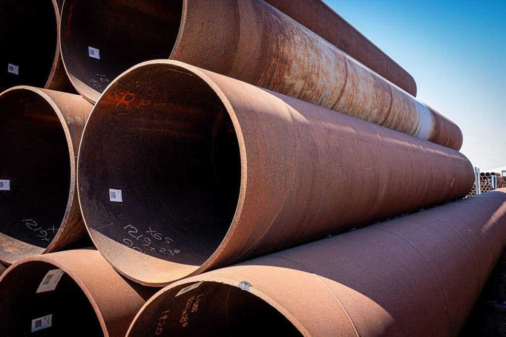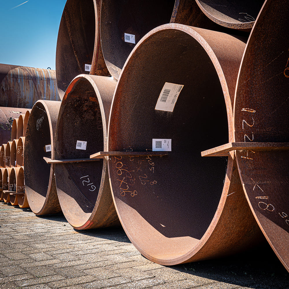 Solines currently has a substantial batch available of large spiral welded steel tubes Ø1200 mm in the steel grades X65 and L415. The tubes are available in multiple wall thicknesses and have a total length of approximately 120 meters, with a total weight of around 72 tons. This batch is in stock in Moerdijk and directly available for a wide range of projects.